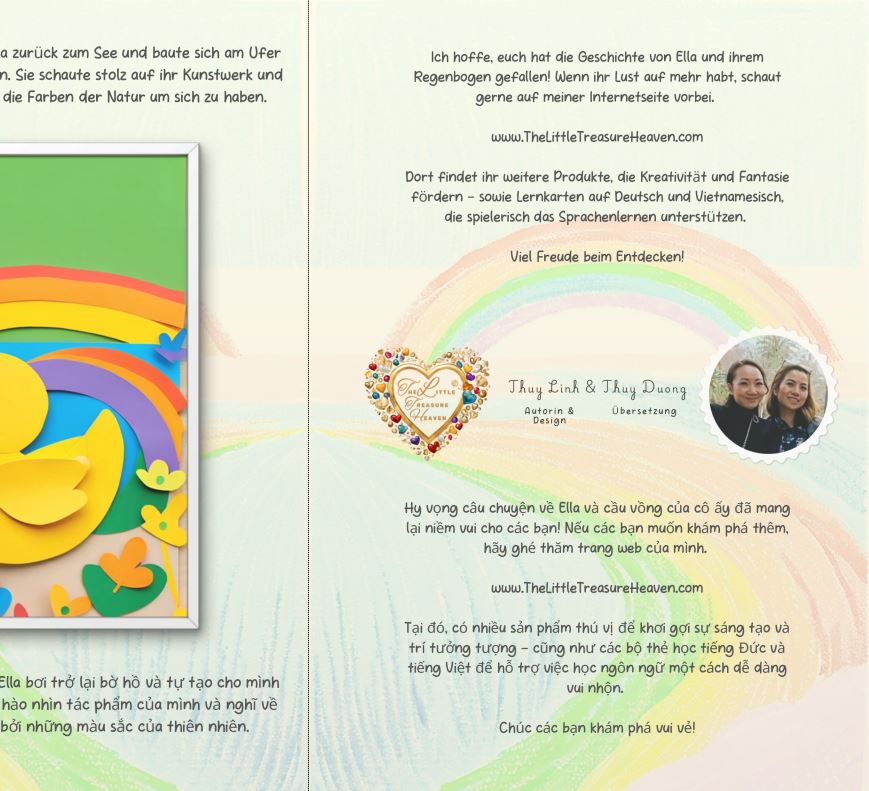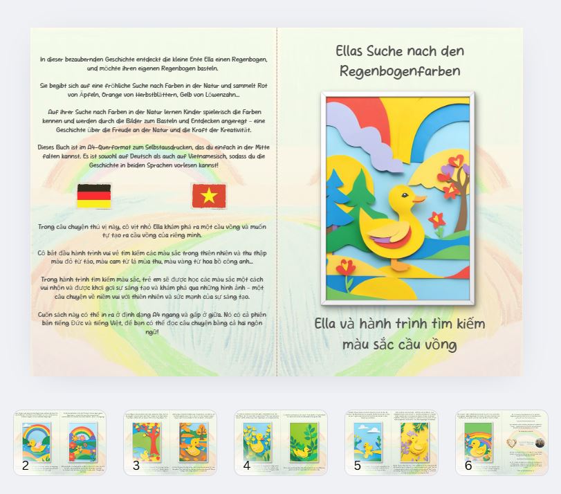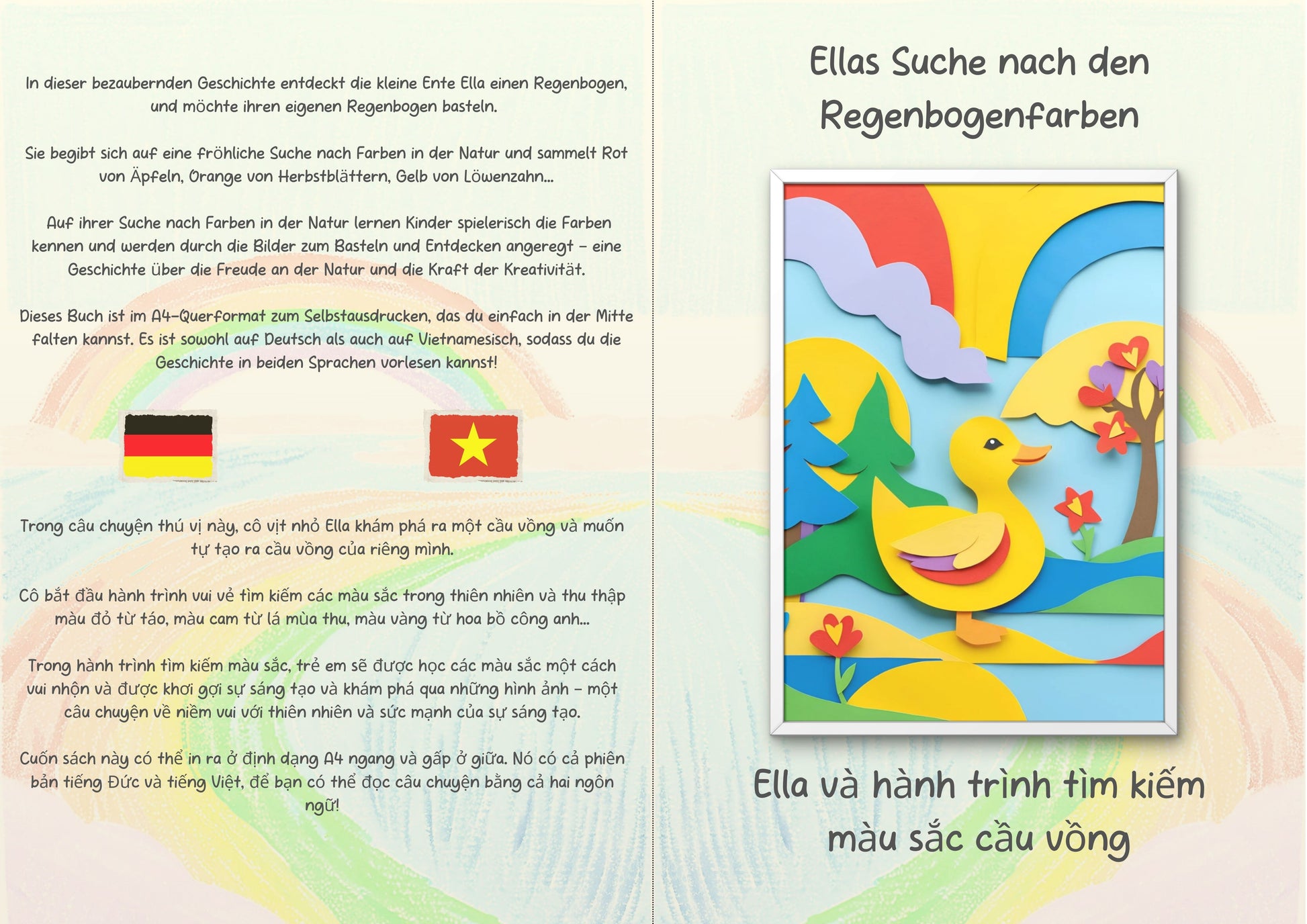 Dieses Buch ist im A4-Querformat zum Selbstausdrucken, das du einfach in der Mitte falten kannst. Es ist sowohl auf Deutsch als auch auf Vietnamesisch, sodass du die Geschichte in beiden Sprachen vorlesen kannst!